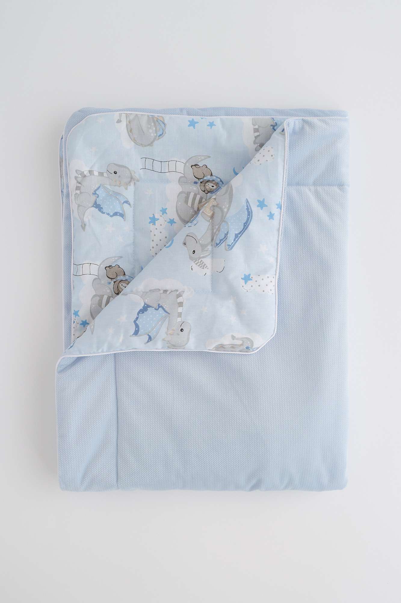 Przytulny i mięciutki kocyk, stworzony z myślą o delikatnej skórze maluszka. Jedna strona wykonana jest z gładkiej tkaniny w kolorze błękitnym, a druga ozdobiona uroczym nadrukiem w misie i słoniki w chmurkach. Kocyk jest lekki, ciepły i oddychający – idealny zarówno do łóżeczka, wózka, jak i na drzemkę w ciągu dnia.