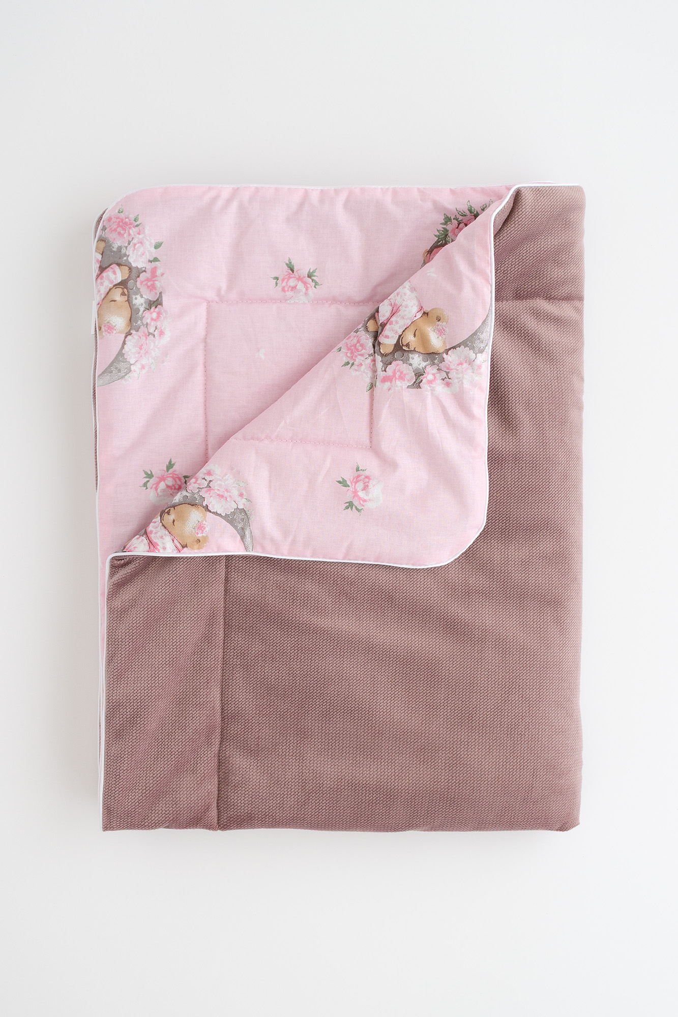 Jedna strona wykonana jest z przyjemnej w dotyku, gładkiej tkaniny w kolorze pudrowego różu z uroczym nadrukiem misiów i kwiatów, a druga ze strukturalnego materiału w stonowanym, przytulnym odcieniu brudnego różu. Kocyk jest lekki, ciepły i oddychający – doskonały zarówno do łóżeczka, jak i wózka.