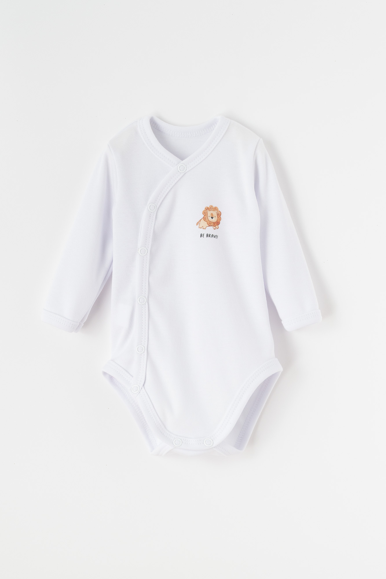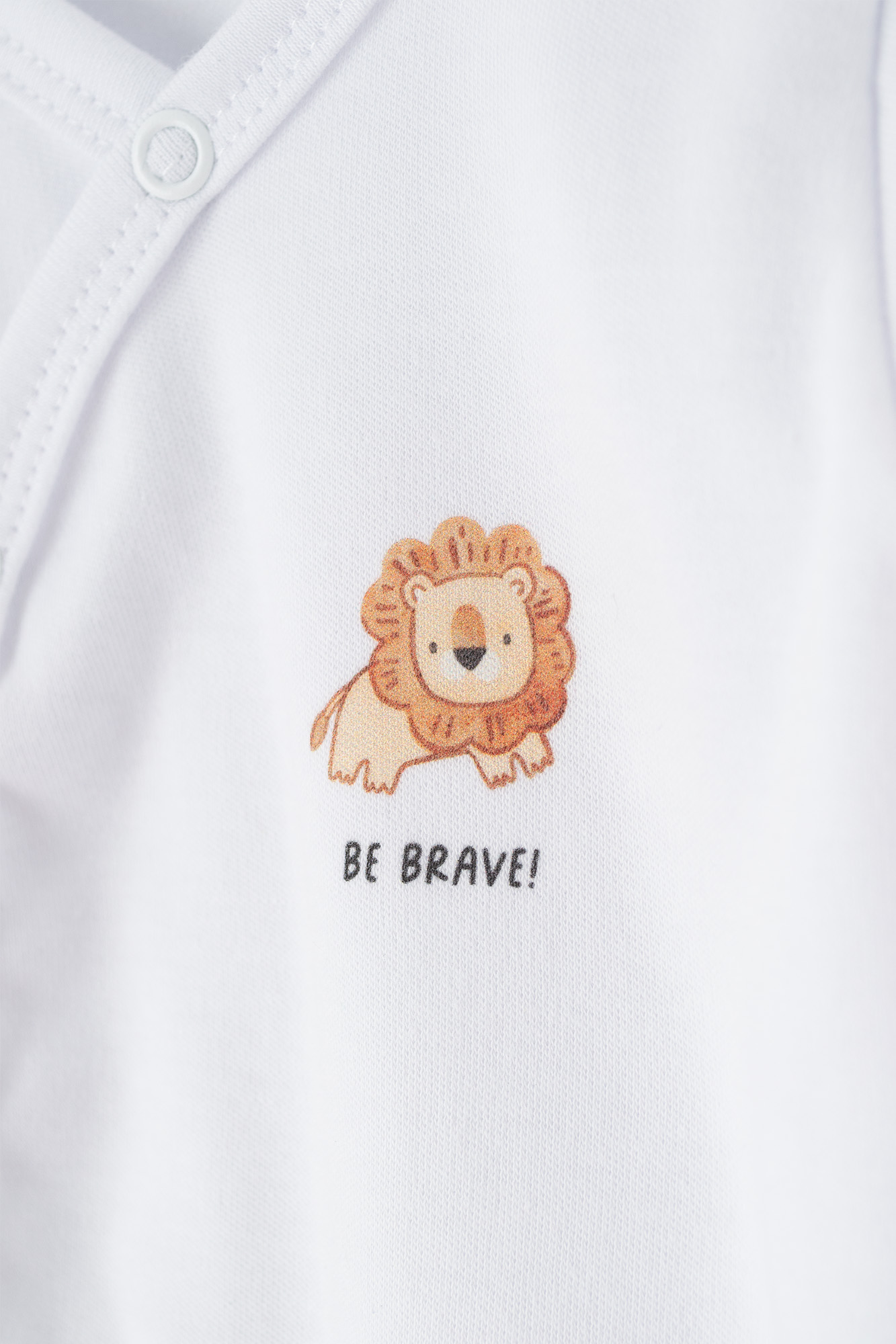 Miękkie i delikatne body niemowlęce w kolorze białym, wykonane z przyjaznej dla skóry dziecka bawełny. Model zapinany kopertowo na wygodne napy, które ułatwiają ubieranie maluszka oraz szybkie przewijanie. Na przodzie znajduje się uroczy nadruk z małym lwem i napisem „BE BRAVE!”, dodający ubranku wyjątkowego uroku.