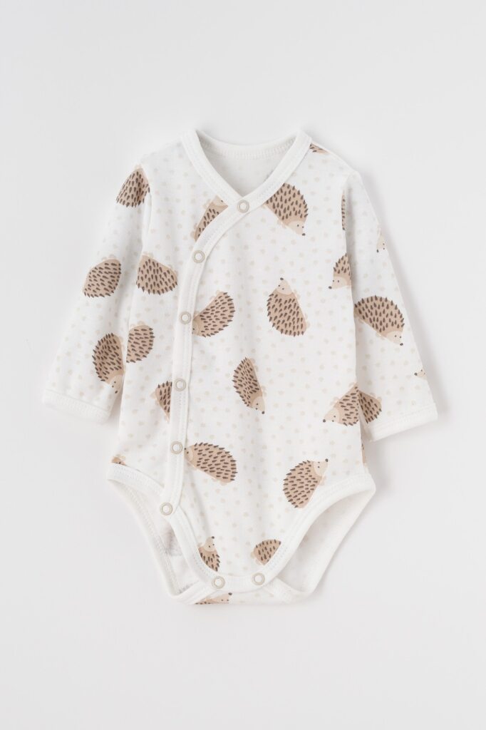 Urocze body dla niemowląt wykonane z miękkiej, oddychającej bawełny, idealne dla delikatnej skóry maluszka. Model w kolorze ecru ozdobiony jest słodkim wzorem jeżyków w odcieniach beżu i brązu. Body posiada praktyczne zapięcie kopertowe na napy, co ułatwia ubieranie i przewijanie dziecka. Długie rękawy sprawiają, że ubranko doskonale sprawdzi się w chłodniejsze dni.