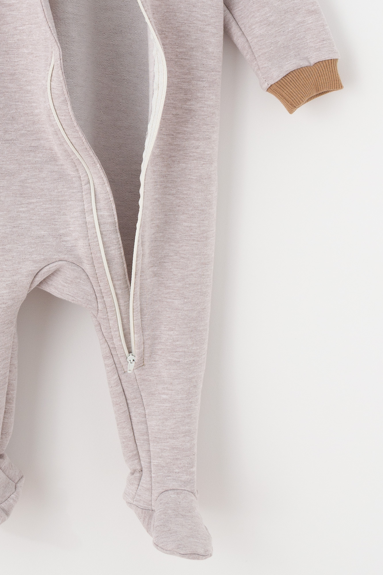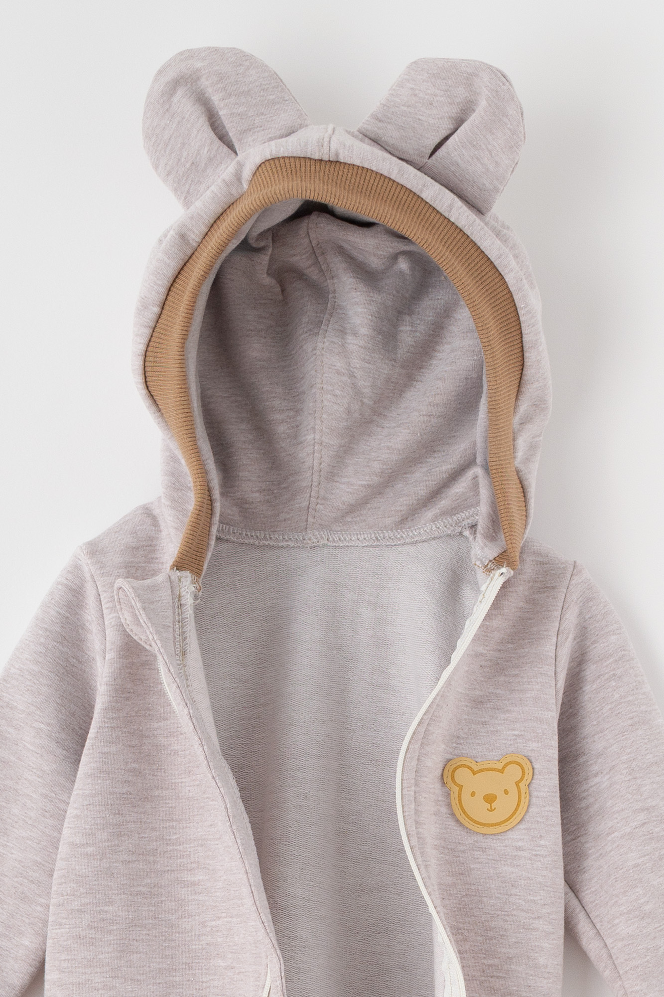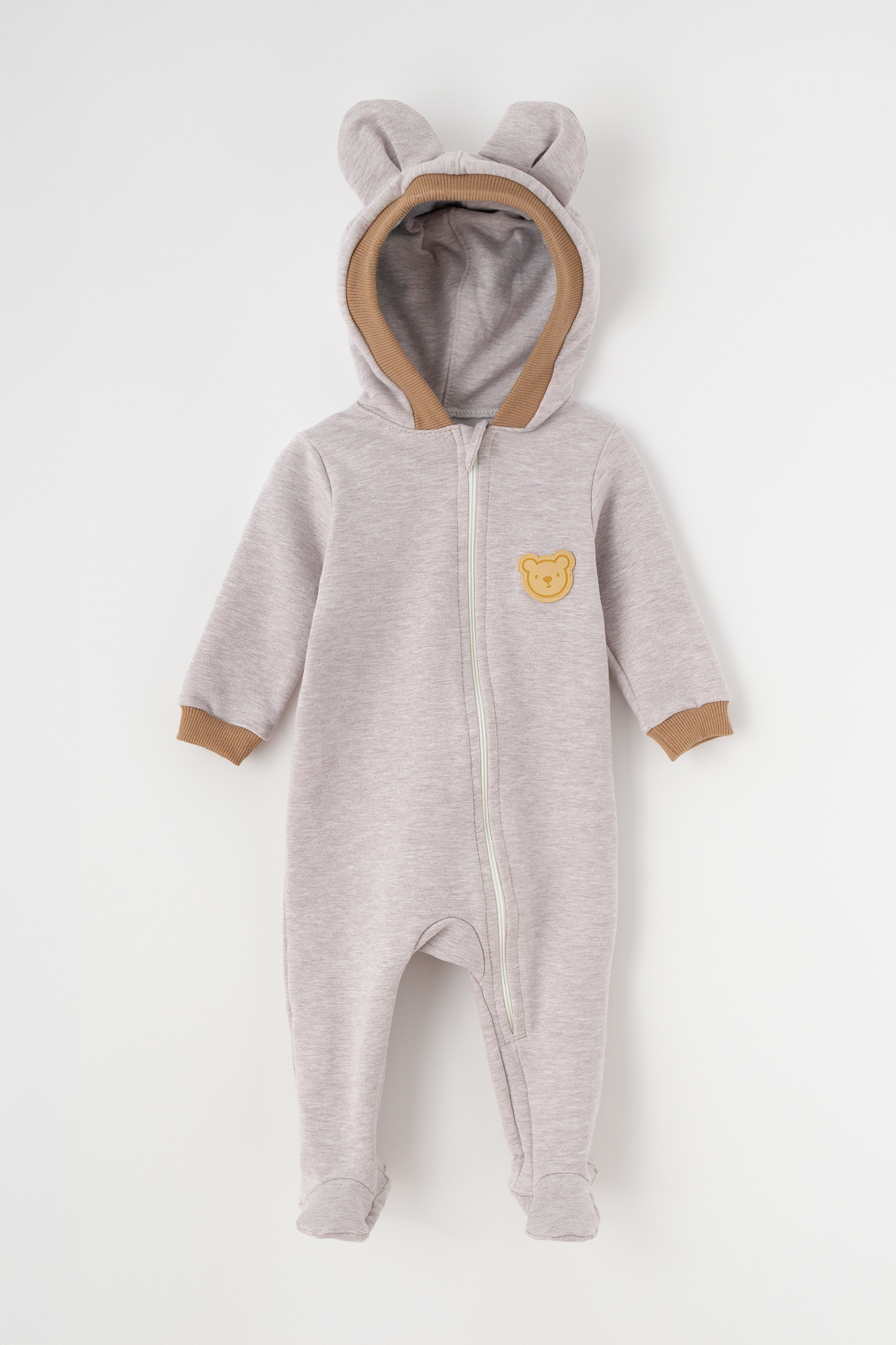Przytulny kombinezon dla niemowląt w kolorze beżowym, wykonany z miękkiej, elastycznej tkaniny, delikatnej dla wrażliwej skóry dziecka. Model posiada kaptur z uroczymi uszkami oraz kontrastowe ściągacze w kolorze karmelowym, które dodają mu stylowego charakteru. Na piersi znajduje się naszywka z wizerunkiem misia w dopasowanym odcieniu. Kombinezon zapinany jest na zamek błyskawiczny biegnący po skosie, co ułatwia ubieranie i przewijanie. Zabudowane stópki zapewniają ciepło i wygodę, dzięki czemu kombinezon doskonale sprawdzi się zarówno w domu, jak i na spacerze w chłodniejsze dni.