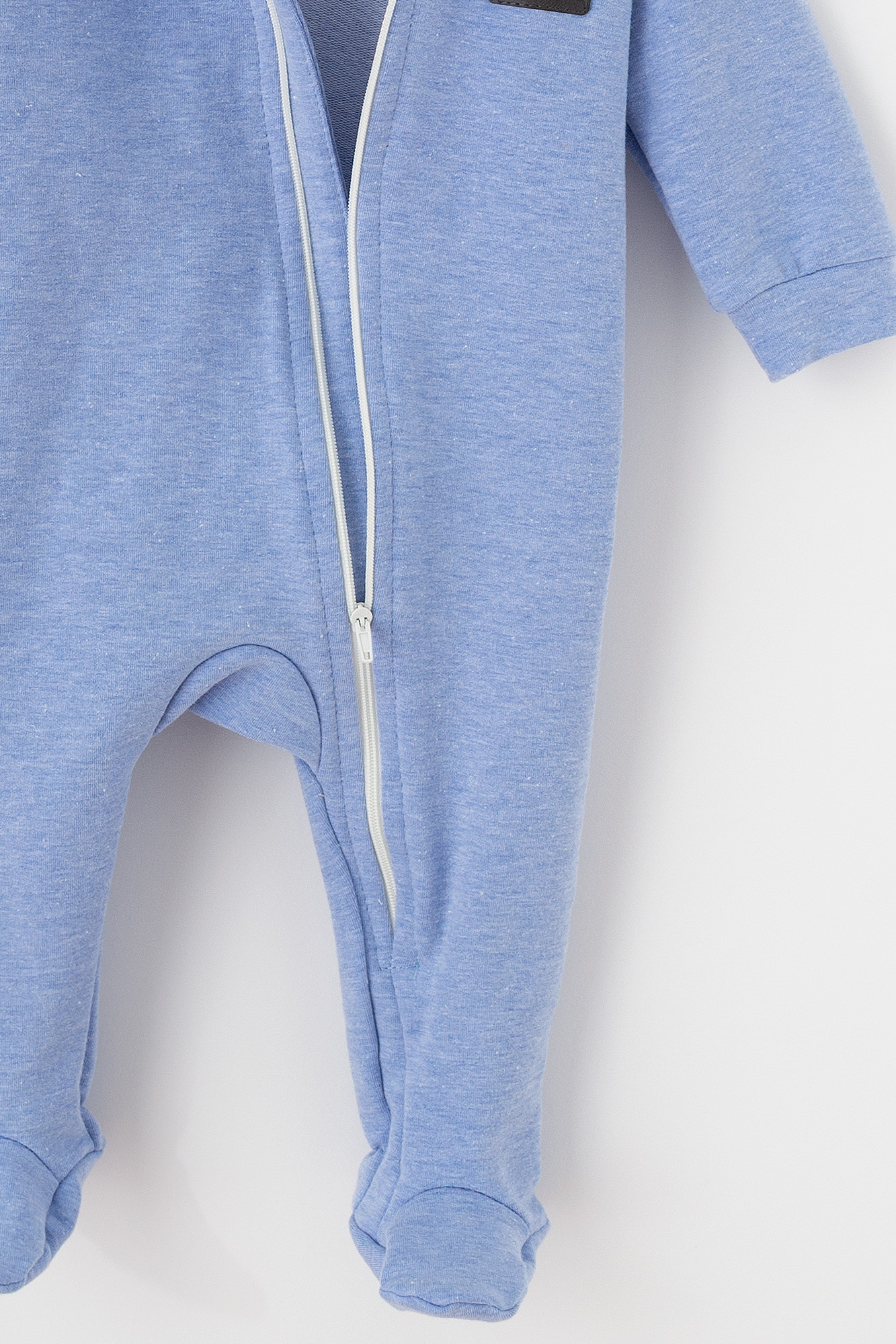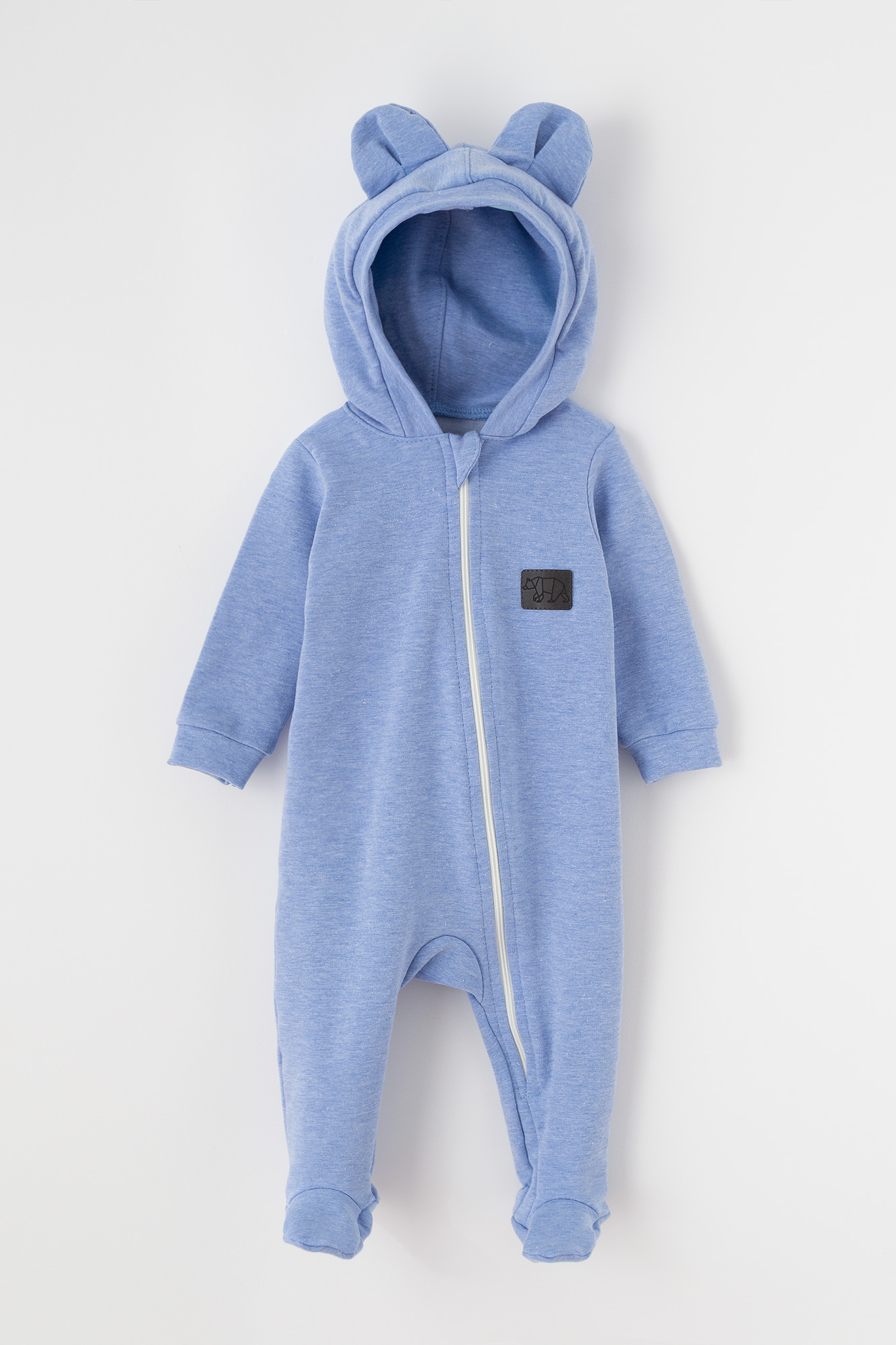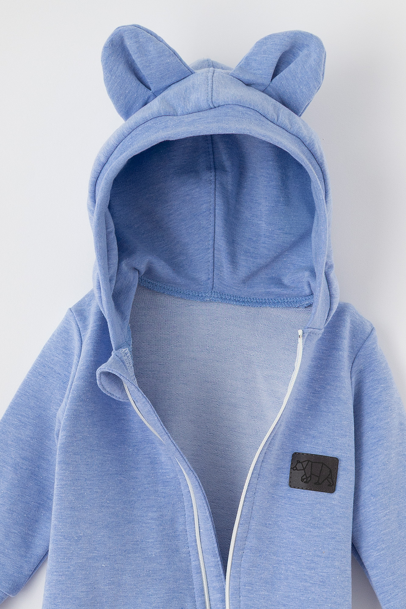 Miękki i wygodny kombinezon dla niemowląt w kolorze niebieskim, idealny na co dzień i do snu. Wykonany z delikatnej, elastycznej dzianiny, przyjaznej dla skóry dziecka. Wyposażony w kaptur z uroczymi uszkami, który dodaje całości słodkiego wyglądu, oraz praktyczny suwak biegnący po skosie, ułatwiający ubieranie i przewijanie. Na piersi znajduje się subtelna naszywka z wizerunkiem misia w kontrastowym kolorze. Zabudowane stópki chronią małe nóżki przed chłodem. To doskonały wybór na chłodniejsze dni i wieczory.