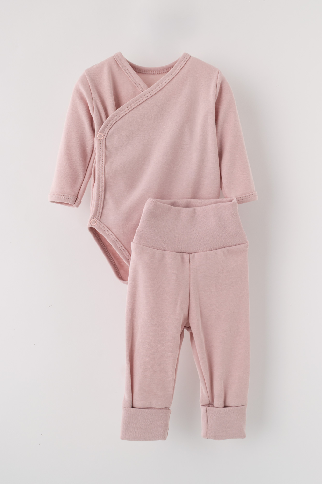 Uroczy i wygodny zestaw dla maluszka w delikatnym, pudroworóżowym odcieniu. Komplet składa się z body z długim rękawem oraz miękkich legginsów z szerokim, elastycznym pasem. Idealny na co dzień – do domu, na spacer lub jako baza pod cieplejsze ubranka.