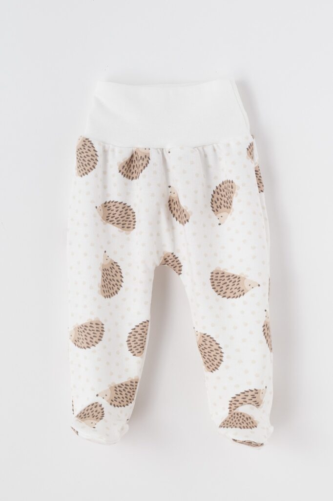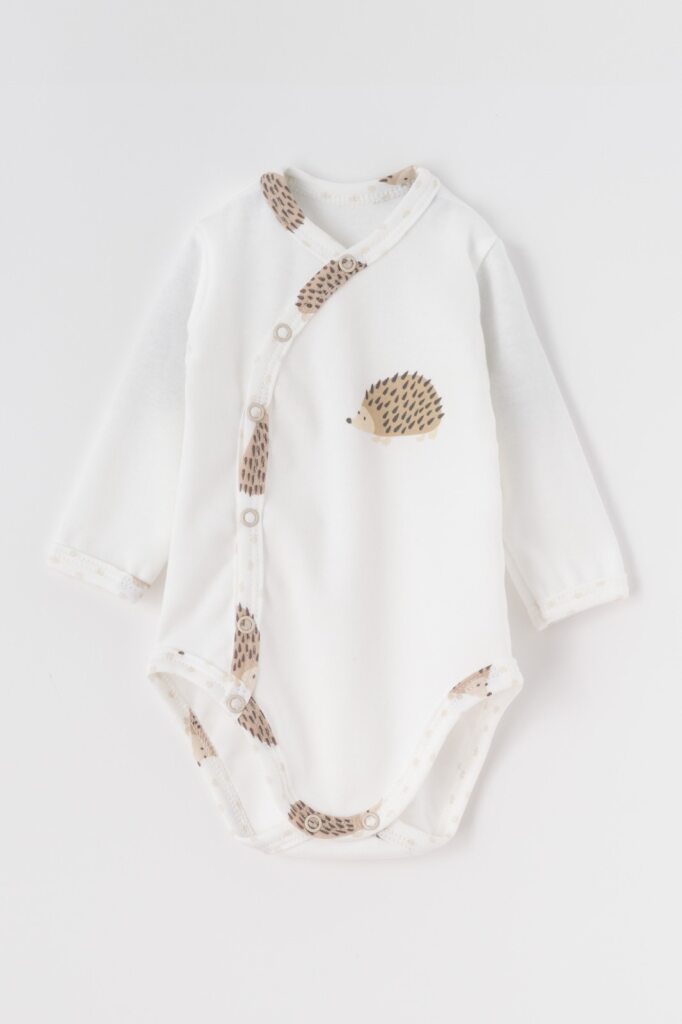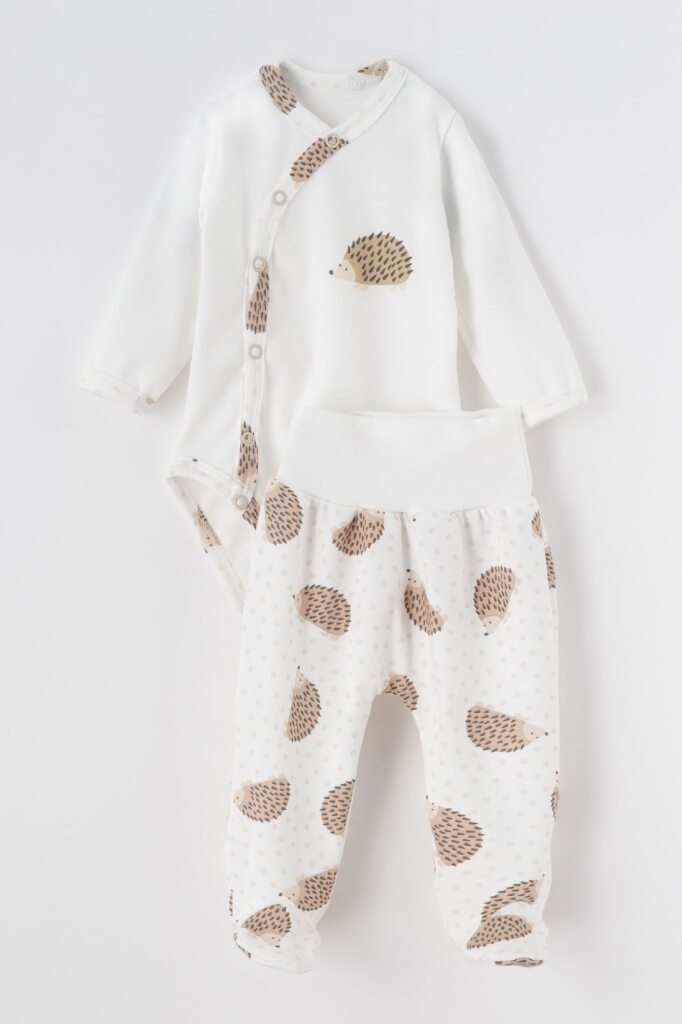 Uroczy komplet dla niemowląt składający się z body kopertowego i spodenek ze stópkami. Wykonany z miękkiej, oddychającej bawełny, doskonale sprawdza się w codziennym użytkowaniu. Body w kolorze ecru ozdobione jest słodkim motywem jeżyka na piersi oraz lamówką w dopasowany wzór. Spodenki w całości pokryte nadrukiem w jeżyki mają szeroki, elastyczny pas, który delikatnie otula brzuszek dziecka i zapewnia maksymalny komfort noszenia.