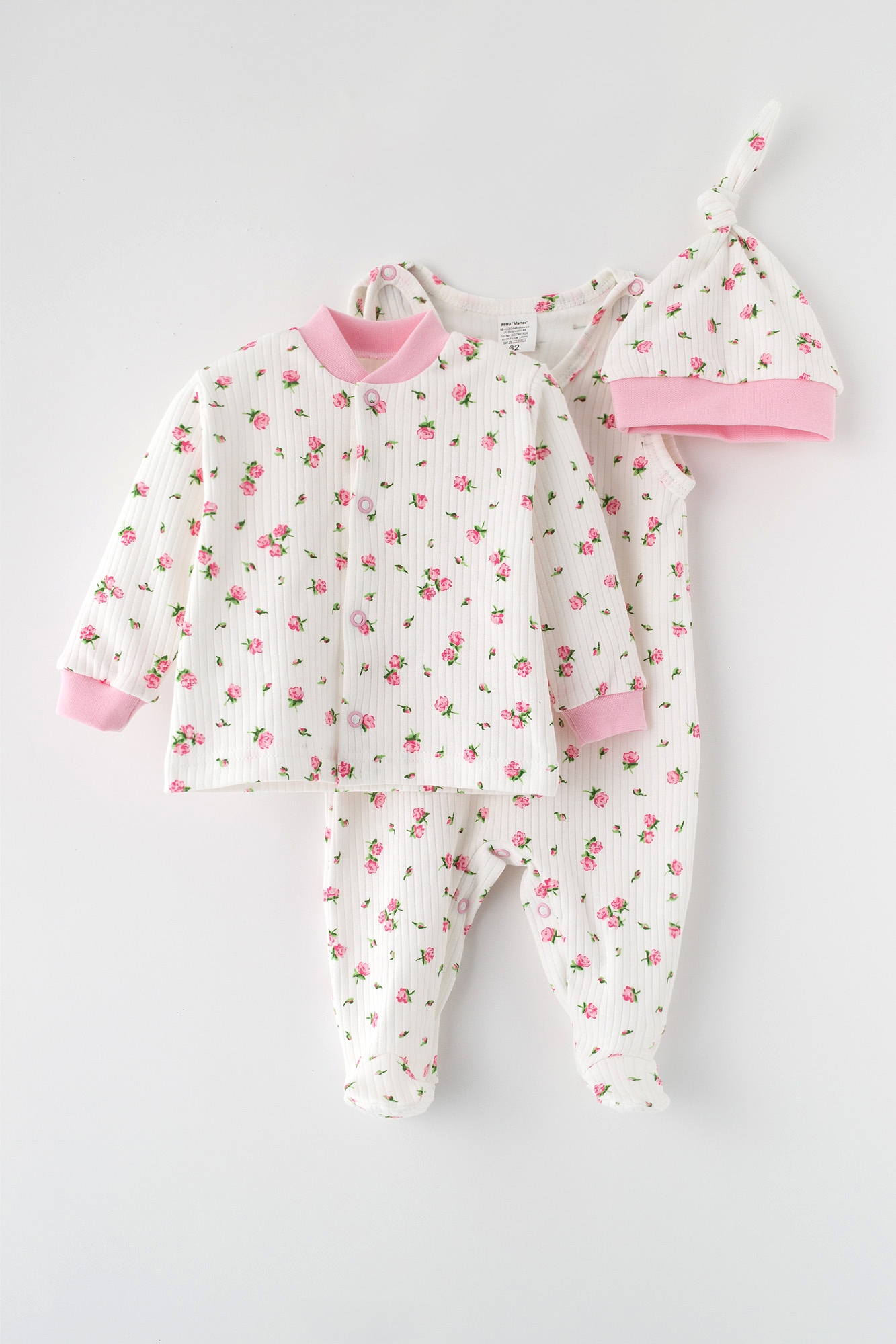 Wprowadź odrobinę klasycznej elegancji do garderoby swojego maluszka. Ten wyjątkowy, 3-częściowy zestaw łączy w sobie ponadczasowy kwiatowy wzór z najwyższą dbałością o komfort noworodka.