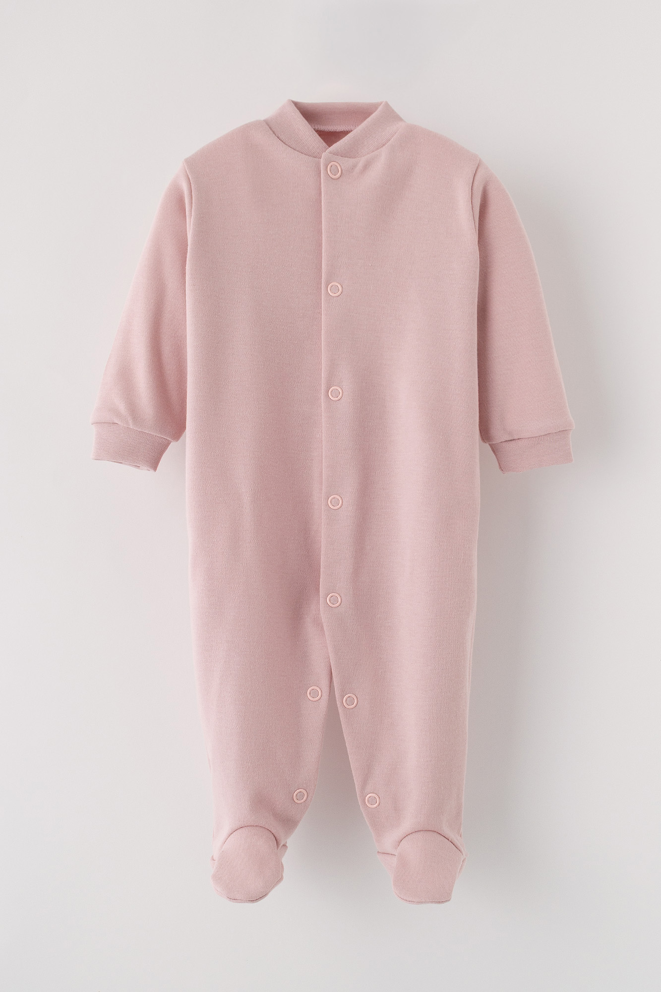 Delikatny i niezwykle wygodny pajac niemowlęcy w modnym, pudroworóżowym kolorze, idealnie pasującym do zestawu ze zdjęcia. To doskonały wybór na dzień i noc – zapewnia maluszkowi komfort, swobodę ruchów i poczucie ciepła.
